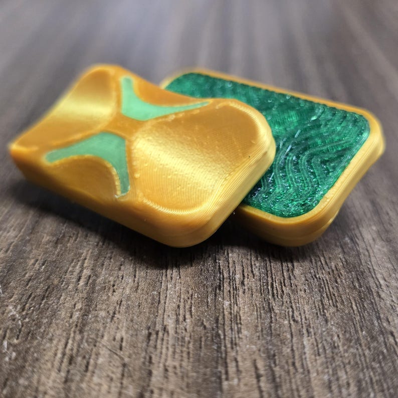 A gold PLA body with green PETG plates and glowing green accents that shine in the dark. Elegant by day, radiant by night. Available in Silent or Crunchy haptics.